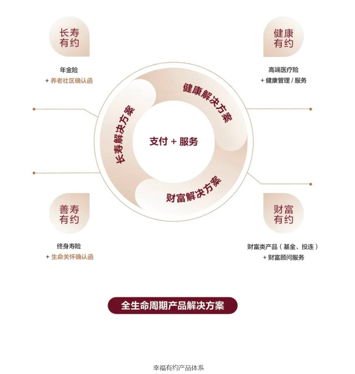 聚焦满足市场医养保障需求,“幸福有约”推出“长寿有约+健康有约”双有约解决方案。“长寿有约”通过“年金险+入住养老社区确认函”的模式,运用复利做好养老规划,打造与生命等长的现金流。“健康有约”通过“健康保险+健康管理+健康服务”的模式,用杠杆做好健康规划,链接优质的医疗健康资源。依托头部企业和专业平台,“双有约”持续护航客户长寿健康幸福人生。