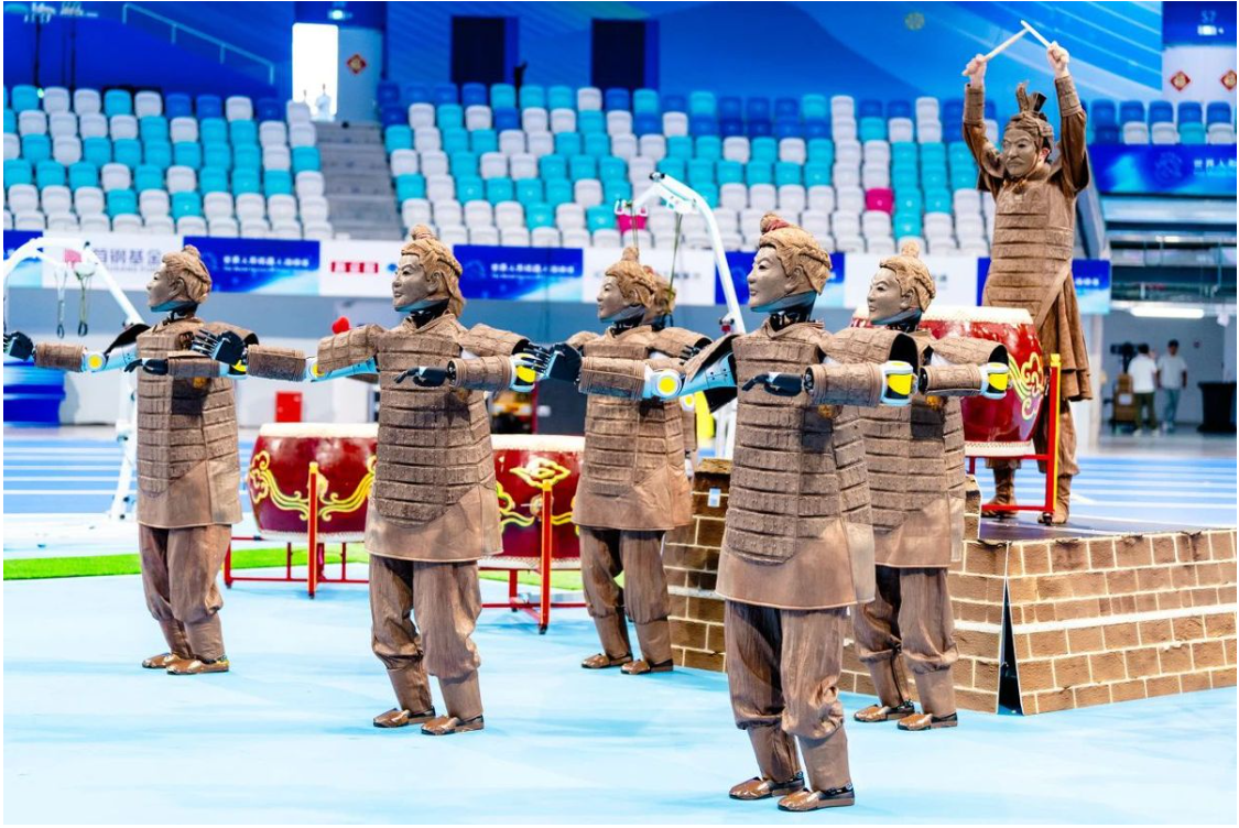 时间倒回至8月14日赛事开幕夜。绛州大鼓的沉闷轰鸣穿透场馆,饰演"将军俑"的舞者挥动鼓槌,9台"光子"机器人应声起舞。它们的机械臂以0.1秒误差同步击打鼓面,战靴踏地激起细微烟尘。在"将军击鼓,率兵奋战"的叙事中,"兵俑"方阵完成七次精准换位,青铜色铠甲随躯体弯折发出机械传动的轻响。