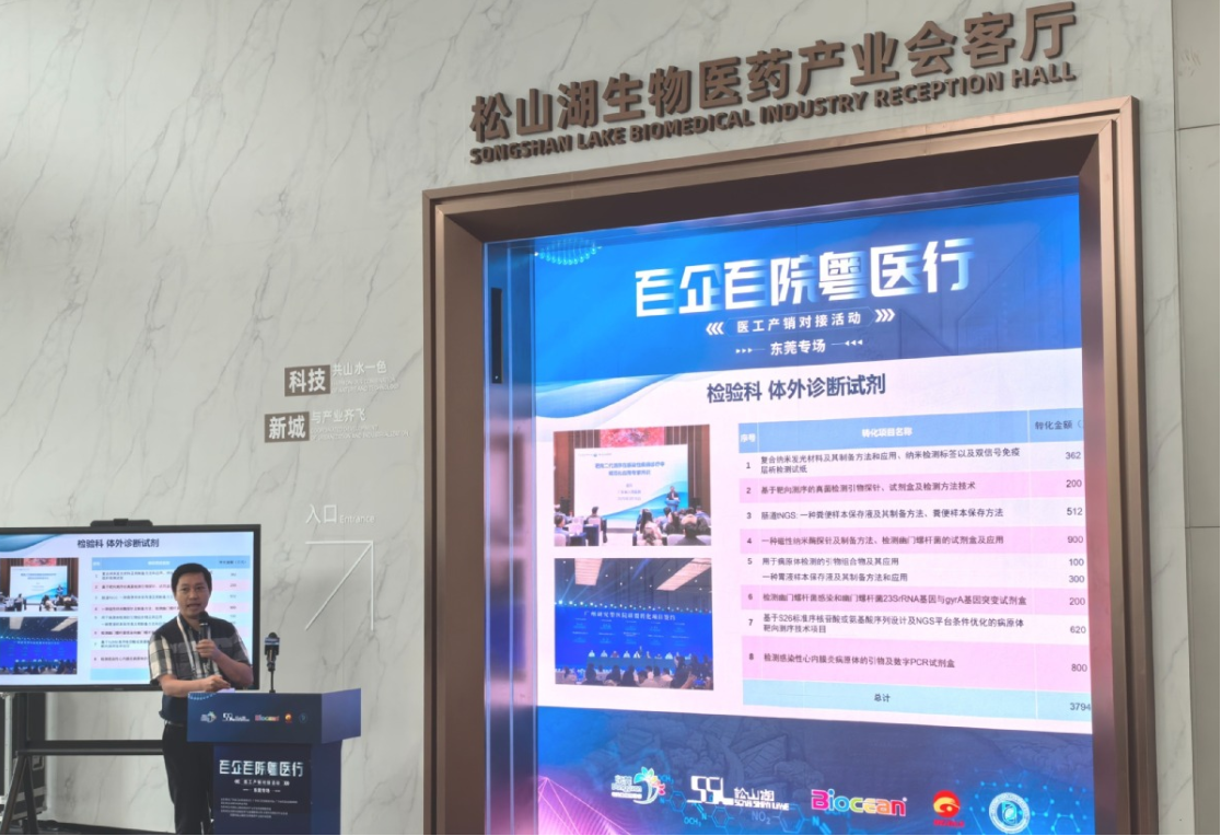 活动设置了企业和医疗机构双向推介环节,东阳光药业、众生药业、博迈医疗、普门生物等企业集中推介了伊非尼酮、来瑞特韦片、冠脉介入球囊、全自动电化学发光免疫分析系统等重点在研和已上市药械产品;23家东莞市重点生物医药企业在现场进行药械产品展示。中山大学附属第一医院、省人民医院、省中医院、广州医科大学附属第一医院广州呼吸健康研究院等医疗机构代表介绍了咽爽合剂、银翘透邪解毒颗粒、多功能下肢保护装置、生物样本资源转运及保藏系列产品等拟转化的科研成果。企业与医院面对面对接洽谈,围绕临床痛点、产品研发和成果应用展开深入交流。