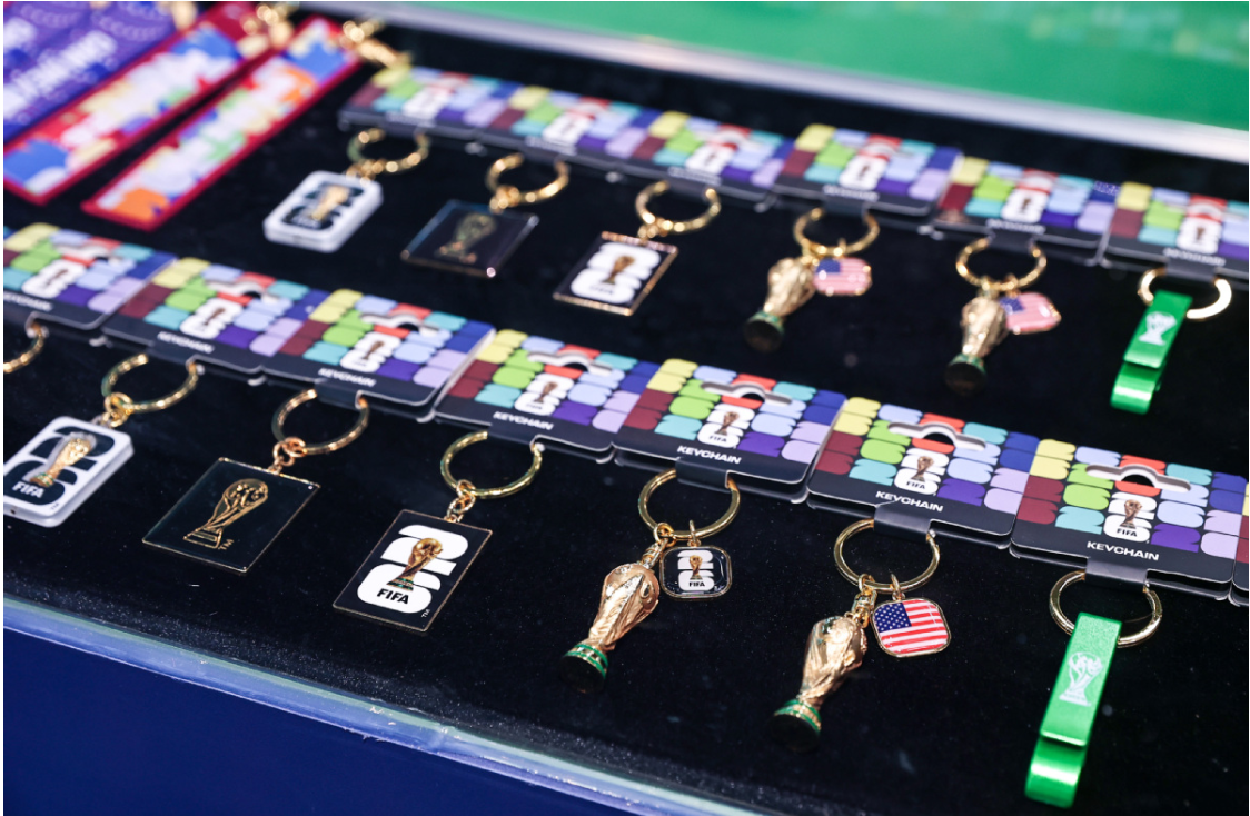 在玮光品牌馆的展区内,多款备受期待的2026世界杯官方授权新品首次在国内线下展出,其中包括全球限量的金杯摆件、钥匙扣、徽章、马克杯、文具及3C配件等。这些精心设计的商品不仅吸引了众多目光,也让参观者能够提前感受到世界杯的激情与魅力。