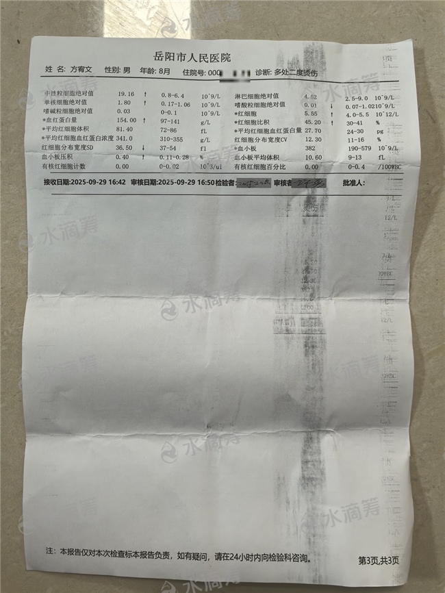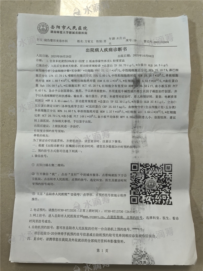 我们慌了神,赶紧脱掉他的衣服,但烫伤已经造成。随着时间的推移,孩子慢慢出现了精神萎靡的情况。我和家人不敢有丝毫耽搁,立刻带着孩子前往医院。经过一系列检查,医生确诊孩子全身多处烫伤20%,为深Ⅱ-Ⅲ度,还伴有低血容量性休克。听到这个诊断结果,我的世界瞬间崩塌了——我怎么也没想到,如此可怕的事情会降临到我那还未好好看看这个世界的儿子身上。