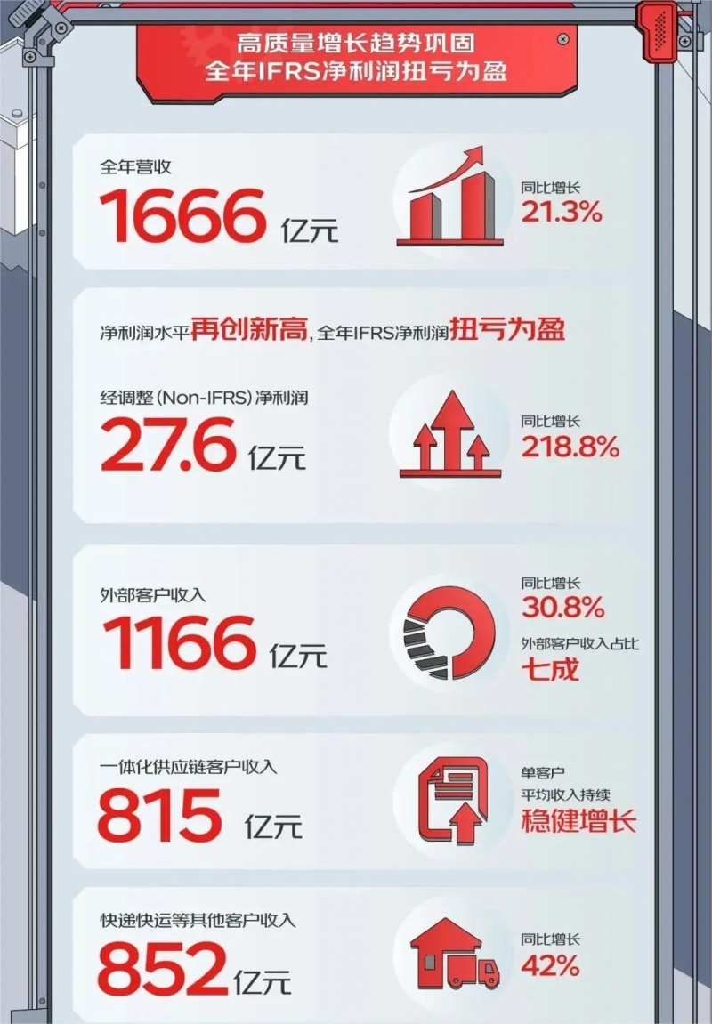 近日,京东物流发布了2023年第四季度及全年业绩报告。2023年,京东物流全年总收入为1666亿,同比增长21.3%;净利润再创新高,达到27.6亿,同比增长218.8%。