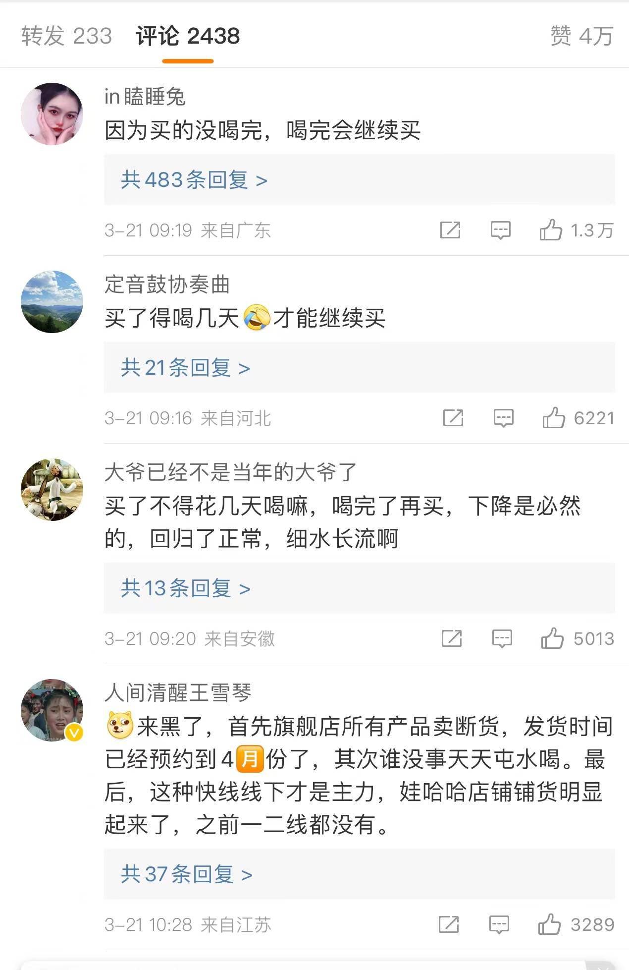 同时,消费者们「按需购买」的理性消费方式也是因素之一,毕竟在前期大量购买产品后,用户肯定需要一段时间的消化。不少网友表示,买了没喝完,喝完会继续买。