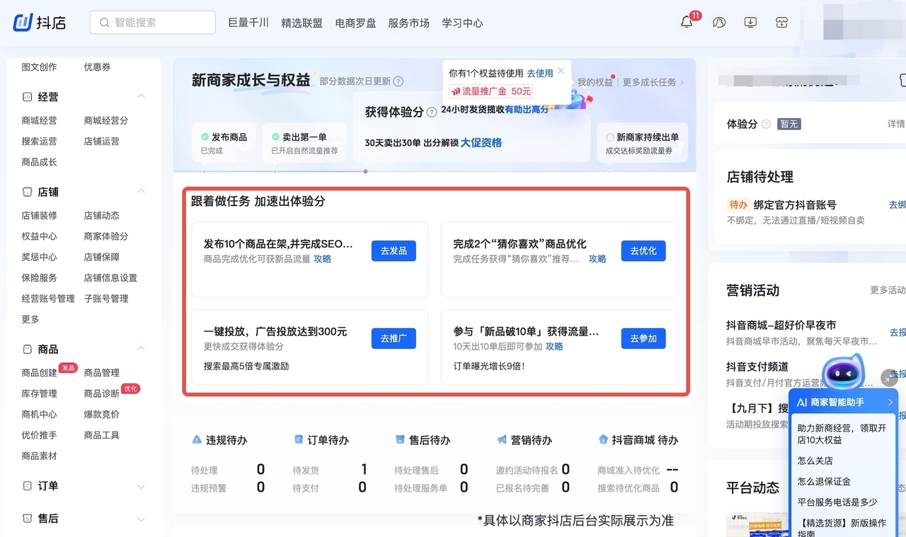 总而言之,任务完成越多,平台奖励越多,获得的曝光和增长也就越多,从而让店铺走向增长的正循环,帮助新商家们安全渡过新手村。