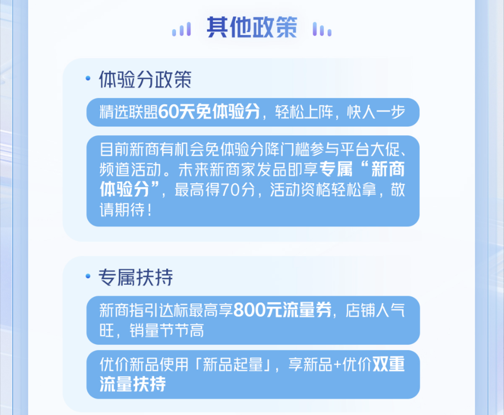 了解了自身优势后,还需要关注新店在什么阶段,平台有什么样的扶持力度,针对哪些方面是会有扶持,这些对新商家的成长有着极大的帮助,也可以说是铺平了新商的半个成长路径。