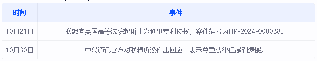 10月21日,联想向英国高等法院起诉中兴通讯专利侵权,案件编号为HP-2024-000038。