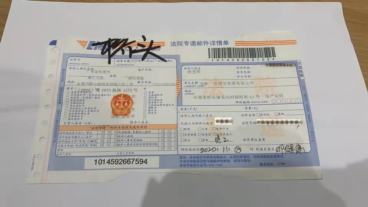 新一信提供的投诉材料还显示,早在今年2月9日,东莞三院在新一信公司能正常签收邮件的情况下,对评估报告、拍卖事项告知书等有关本次拍卖的重要文件的邮件送达时,只写收件人为新一信公司,却没写联系人及联系电话,致使邮件被退回。同时在前一天即2月8日就提前粘贴公告。