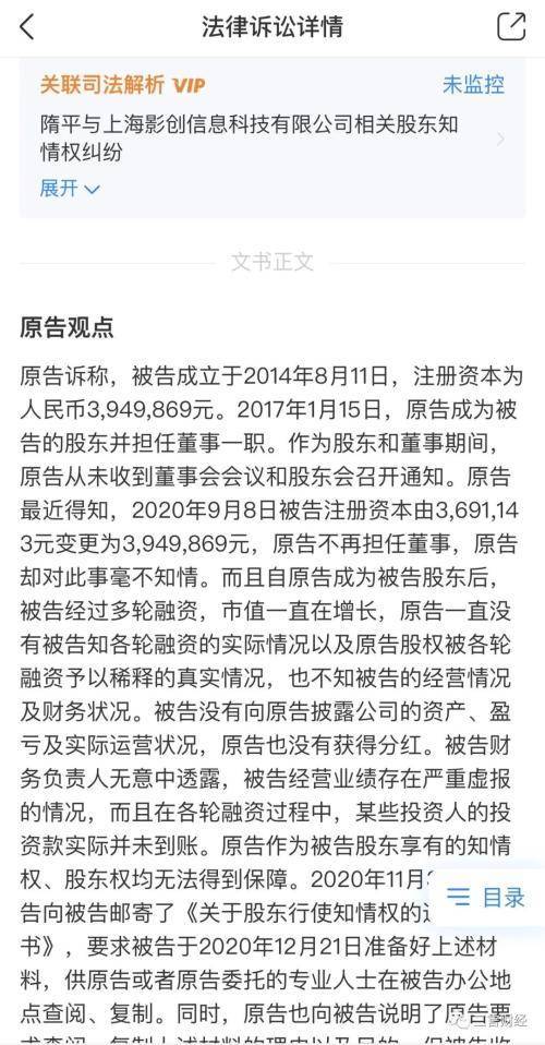 其中股东知情权纠纷的法律文书中提到,该股东曾从影创财务负责人处得知,影创经营业绩存在严重虚报的情况。