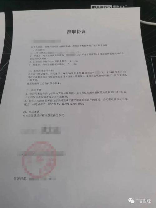 该员工还透露,自己离职时只是有一张离职证明。而后来离职员工还签了一份离职协议。协议的主要内容就是公司承诺将于8月、9月份陆续付清所欠薪资。