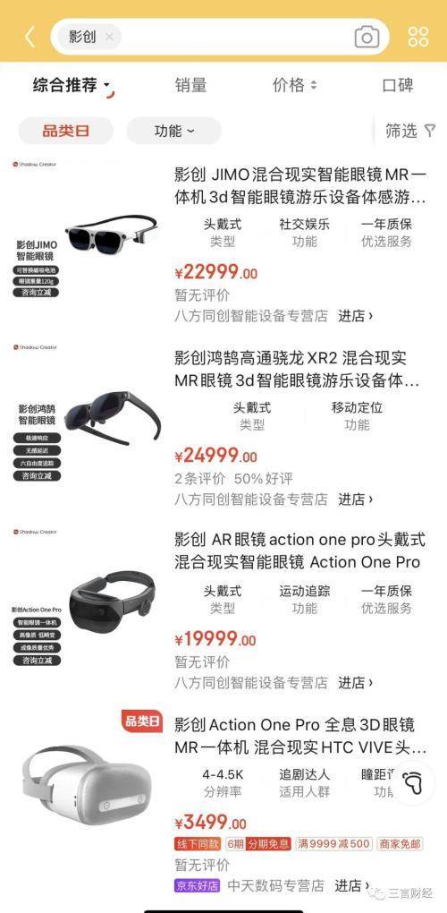 三言财经在京东搜索“影创”,排名靠前的几款影创智能眼镜基本都没有任何评价。