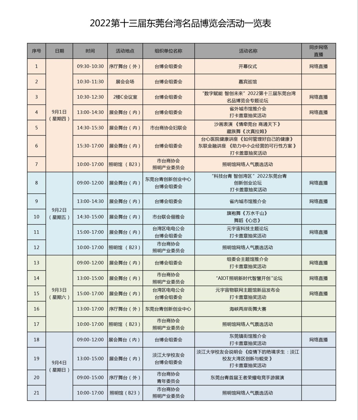 为了让大家在参展逛展中深入了解海峡两岸的文化与行业趋势,2022第十三届东莞台湾名品博览会将在展会期间,为大家带来丰富多彩的活动,这里为大家奉上今年东莞台博会最全最新的展会活动一览表,活动多多,大家可提前收藏、计划好行程!(东莞+)