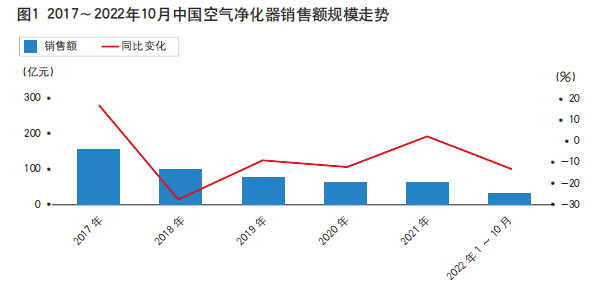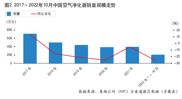 中国空气净化器市场自2017年达到巅峰后,近5年都处于规模下滑的发展态势中。奥维云网(AVC)全渠道推总数据显示,中国空气净化器市场零售额从2017年的162亿元一路萎缩,到2021年已不足66亿元。进入2022年,空气净化器市场规模继续大幅下滑。截至10月,中国空气净化器零售额为38.1亿元,同比下降22%;零售量为210万台,同比下降27%(见图1、图2)。