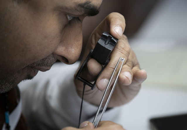 3月29日,买家在以色列拉马特甘的钻石展现场查看钻石。2023以色列国际钻石展于3月28日至30日在以色列拉马特甘举行,吸引数百家参展商参展。(来源: 经济参考报)
