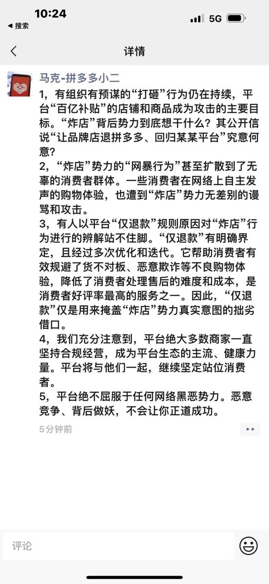 这一切都在说明,事件最终的结果可能和“炸店”势力的表面想达到的目的相反。拼多多小二进行了强硬的回应,并指出“仅退款”只是用来掩盖“炸店”势力真实意图的拙劣借口和操作手段,背后势力另有所指。