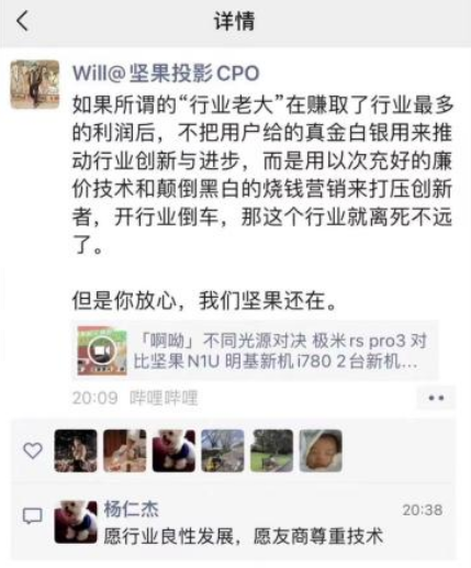 但是,这则视频随后被坚果投影CPO Will转发至朋友圈,并引起了投影圈的轩然大波。