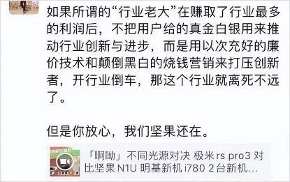 Will在朋友圈表示:“如果所谓的‘行业老大’在赚取了行业最多的利润后,不把用户给的真金白银用来推动行业创新与进步,而是用以次充好的廉价技术和颠倒黑白的烧钱营销来打压创新者,开行业倒车,那这个行业就离死不远了。”