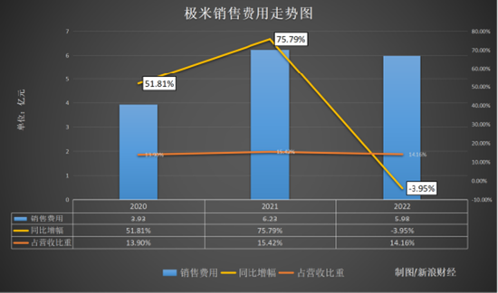 作为一家上市公司,极米的营销费用在财报中展现的非常清楚。销售费用方面,极米2020年和2021年增长迅速,幅度为两位数,2022年销售费用为5.98亿元,同比下降3.95%;销售费用率为14.16%,同比微降。