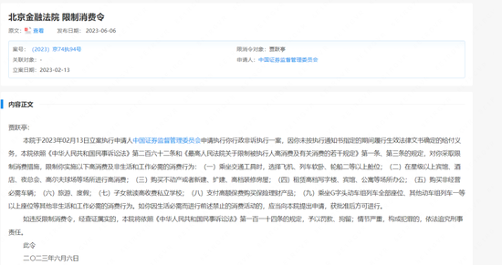 这项发布于今年6月6日的限制消费令,由北京金融法院发布,限制消费对象为贾跃亭本人,申请人为中国证监会。