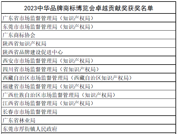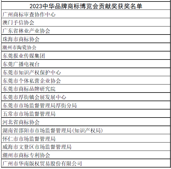 为表彰对第十三届中国国际商标品牌节和2023中华品牌商标博览会组织实施工作作出贡献的有关单位和人员,6月19日晚,在第十三届中国国际商标品牌节闭幕会上,颁发了“2023中华品牌商标博览会卓越贡献奖”“2023中华品牌商标博览会贡献奖”。获奖名单(注:排名不分先后)具体如下: