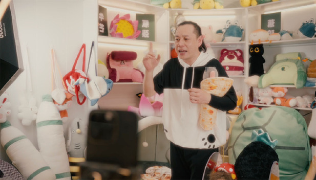 扬州毛绒玩具已形成产业带,图为商家走进直播间与消费者直接交流。