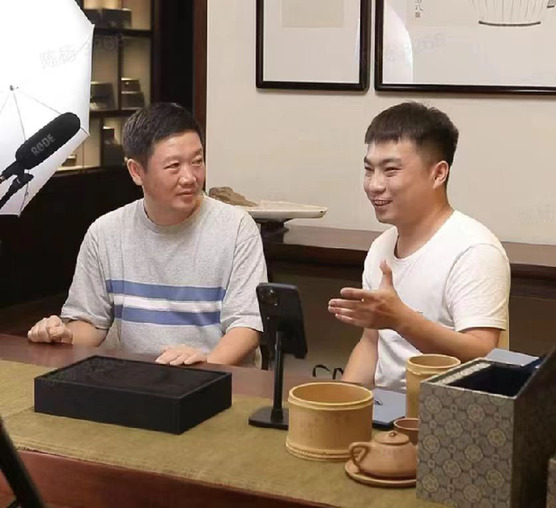 宜兴紫砂产业带商家邀请中青年紫砂壶大师王翔(左)参与直播间解说。