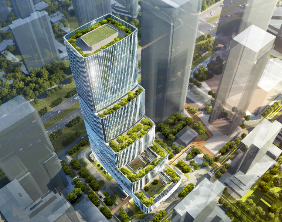 项目建筑采用单塔方案,整体设计提取象征东莞人民奋发向上精神的黄旗山形态,结合岭南文化特色可园的设计手法,打造寓意项目节节高升的建筑形象。