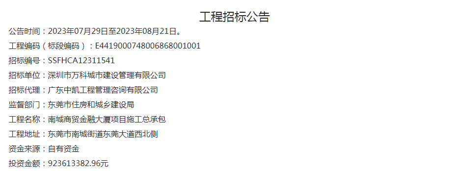 根据招标公告,“南城商贸金融大厦项目施工总承包”的招标单位为深圳市万科城市建设管理有限公司。项目总建筑面积约19.61万平方米,其中地上44层,地上建筑面积约140949.6平方米,最大建筑高度约199.9米,结构最大跨度22米;地下4层(其中地下4层主体结构不在本次招标范围内),地下建筑面积约55191.7平方米。