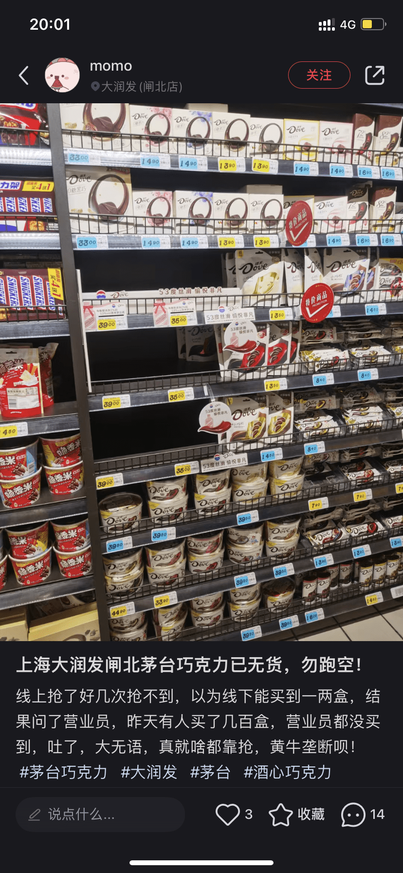 上海闸北大润发发布茅台巧克力售罄信息