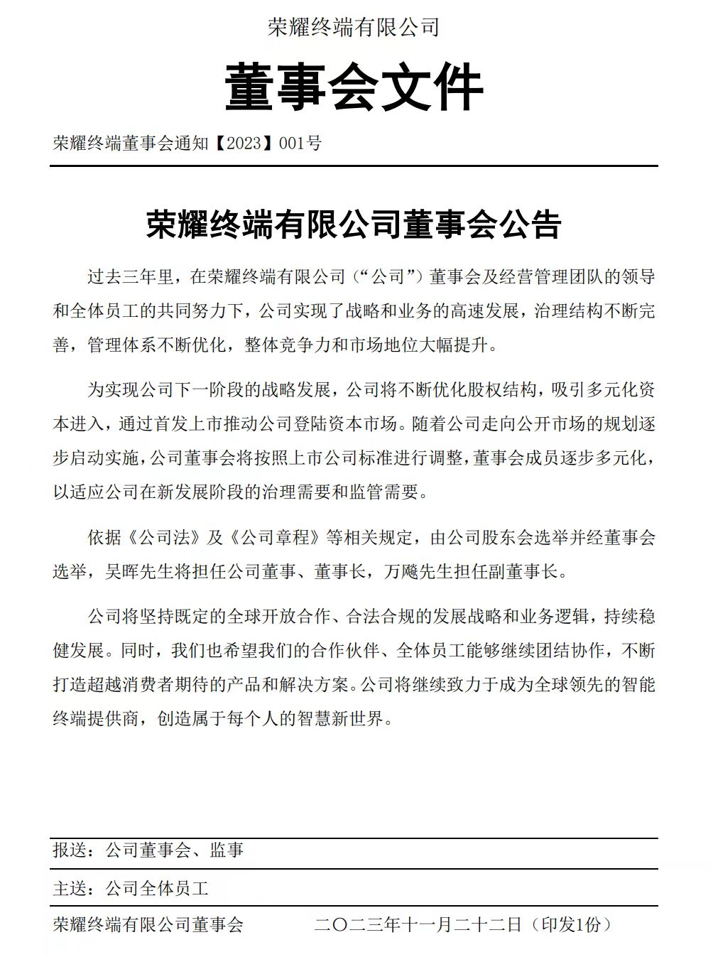 近日,时代周报记者获得的一份荣耀董事会公告文件显示:为实现公司下一阶段的战略发展,公司将不断优化股权结构,吸引多元化资本进入,通过首发上市推动公司登陆资本市场。