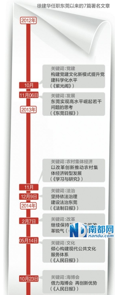徐建华的署名文章并不鲜见。南都记者通过梳理发现,自2011年12月来莞担任市委书记至今,徐建华至少在报纸杂志发表了7篇署名文章。其文章主题各有不同,从东莞实现高水平崛起的问题到深化改革的思考,从农村集体经济转型到构建现代公共文化服务体系的思路,从党建到法治建设的经验,均有涉及。从其选题看来,均为当前东莞市委市政府的工作重点。
