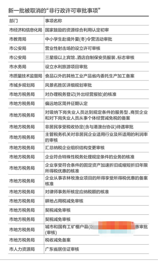 在被取消的非行政许可审批事项中,包括“国家鼓励的资源综合利用认定初审”、“中小学生赴境外夏(冬)令营活动审批”、“三星级以上宾馆、酒店自制保安员服装、标志审核”、“食品以外的其他工业产品省内委托生产加工备案”、“风景名胜区详细规划审批”、“广东省居住证审核”等,共涉及公安、教育、水务等8个政府部门。