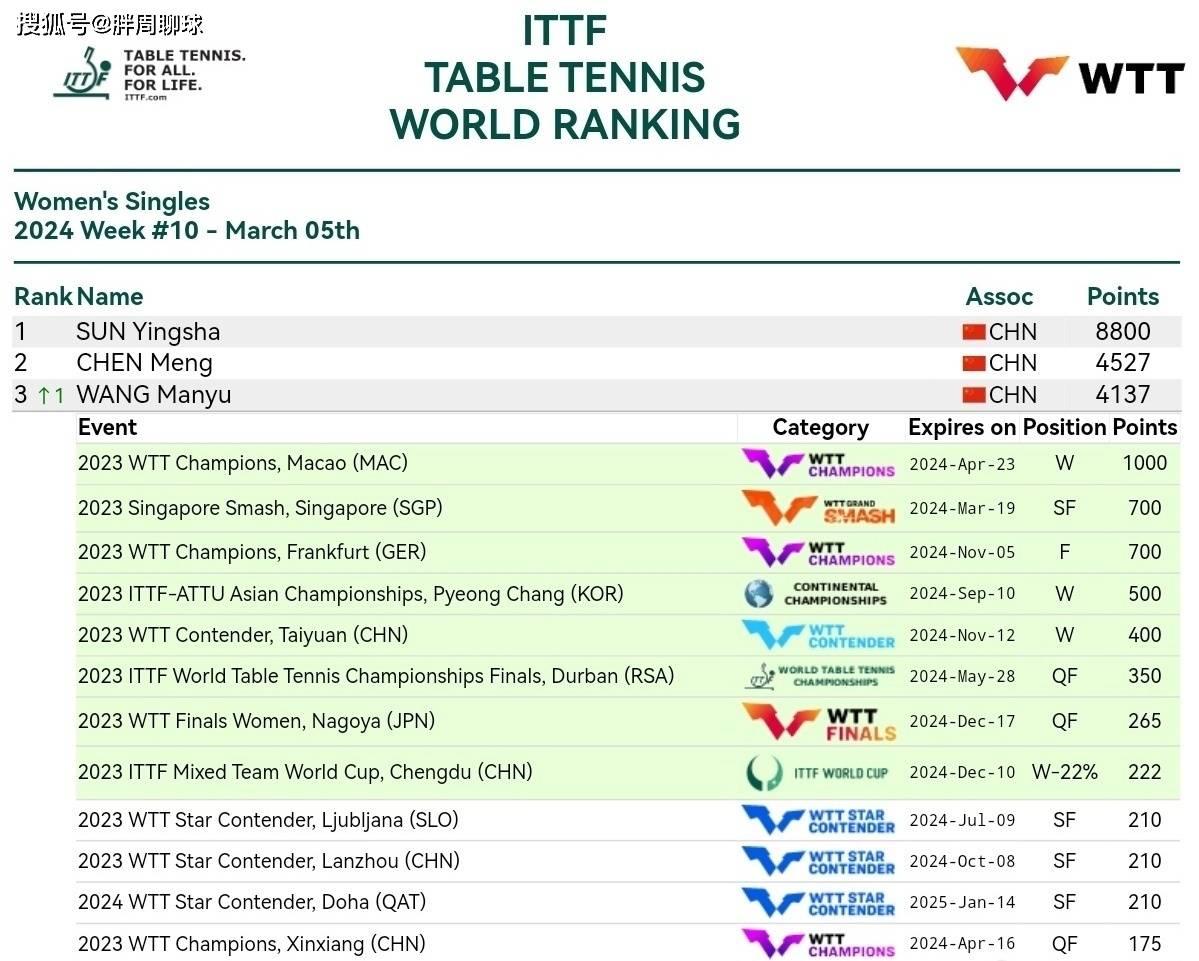 值得一提的是,距离巴黎奥运会越来越近,大家对于哪些队员能够拿到奥运门票这件事的关注度也在越来越高,尤其是国乒女队的竞争非常激烈,孙颖莎独树一帜目前肯定会锁定一个单打门票,将大概率身兼三项出战巴黎奥运会,毕竟孙颖莎混双世界第一,单打世界第一,而且世界积分都是断层优势,所以说孙颖莎实至名归地位无可撼动,而睡会拿到第二个参加奥运的单打门票悬念就很大了。