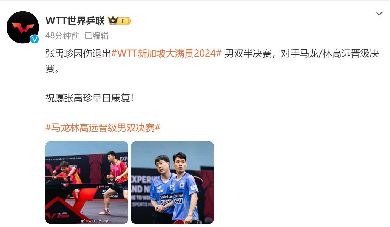 因此龙头组合从一开始就保持了绝对的专注度,前两局11比2、11比3赢得轻松,第三局国乒组合10比12告负,但之后也没有给对手机会,11比8结束悬念,大比分3比1晋级。另外一场半决赛,因为韩国组合张禹珍/林钟勋退赛,所以马龙/林高远不战而胜进入到决赛。国乒提前包揽男双冠亚军。