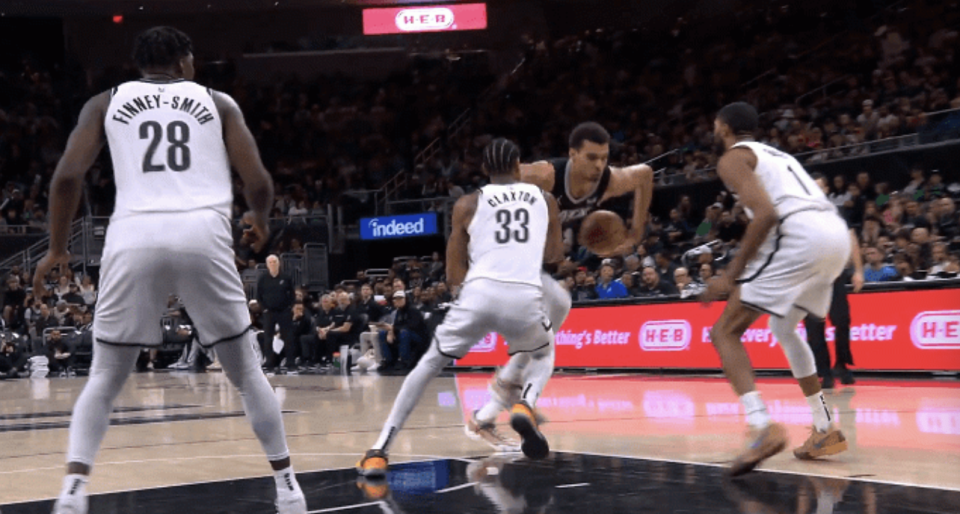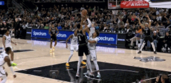 下半场回来,两边依然比分紧咬。第三节最后一攻,文班亚马上篮命中,马刺三节80-83落后。第四节还剩4分36秒,文班亚马重新上场之后就命中关键球,一记大心脏三分,帮助马刺追到101-105,打停了篮网,全场沸腾。