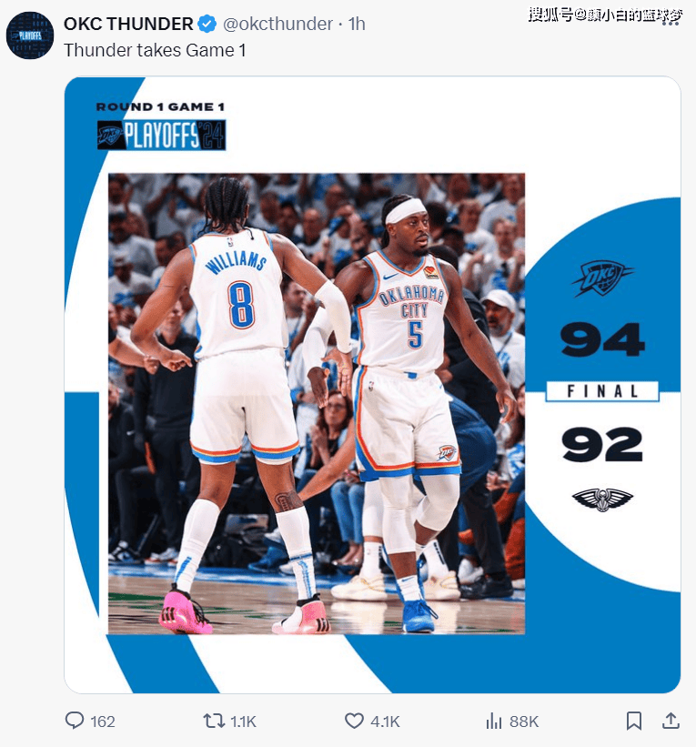 西部第一的雷霆94-92险胜西部第八鹈鹕,鹈鹕挑选OKC作为对手真对了,但关键时刻连续4投不中葬送比赛,输掉G1后鹈鹕在这一轮系列赛难度就很大了。