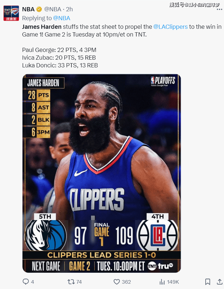 北京时间4月22日,NBA首轮四场对决落下帷幕,西部第四的快船109-97大胜西部第五的独行侠。哈登28分8助攻2盖帽6个三分球成为关键先生。