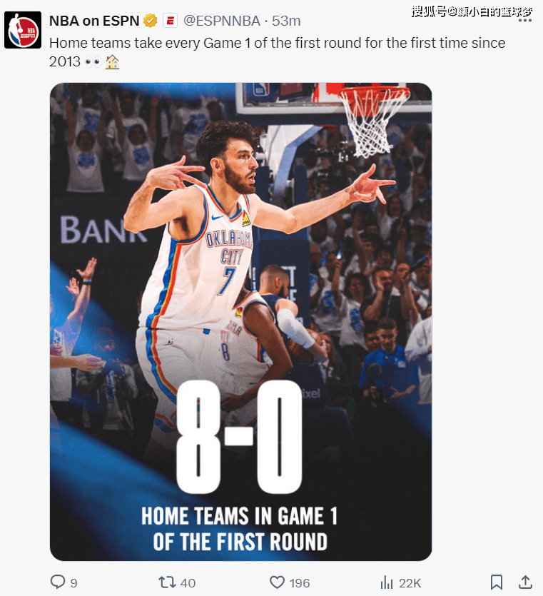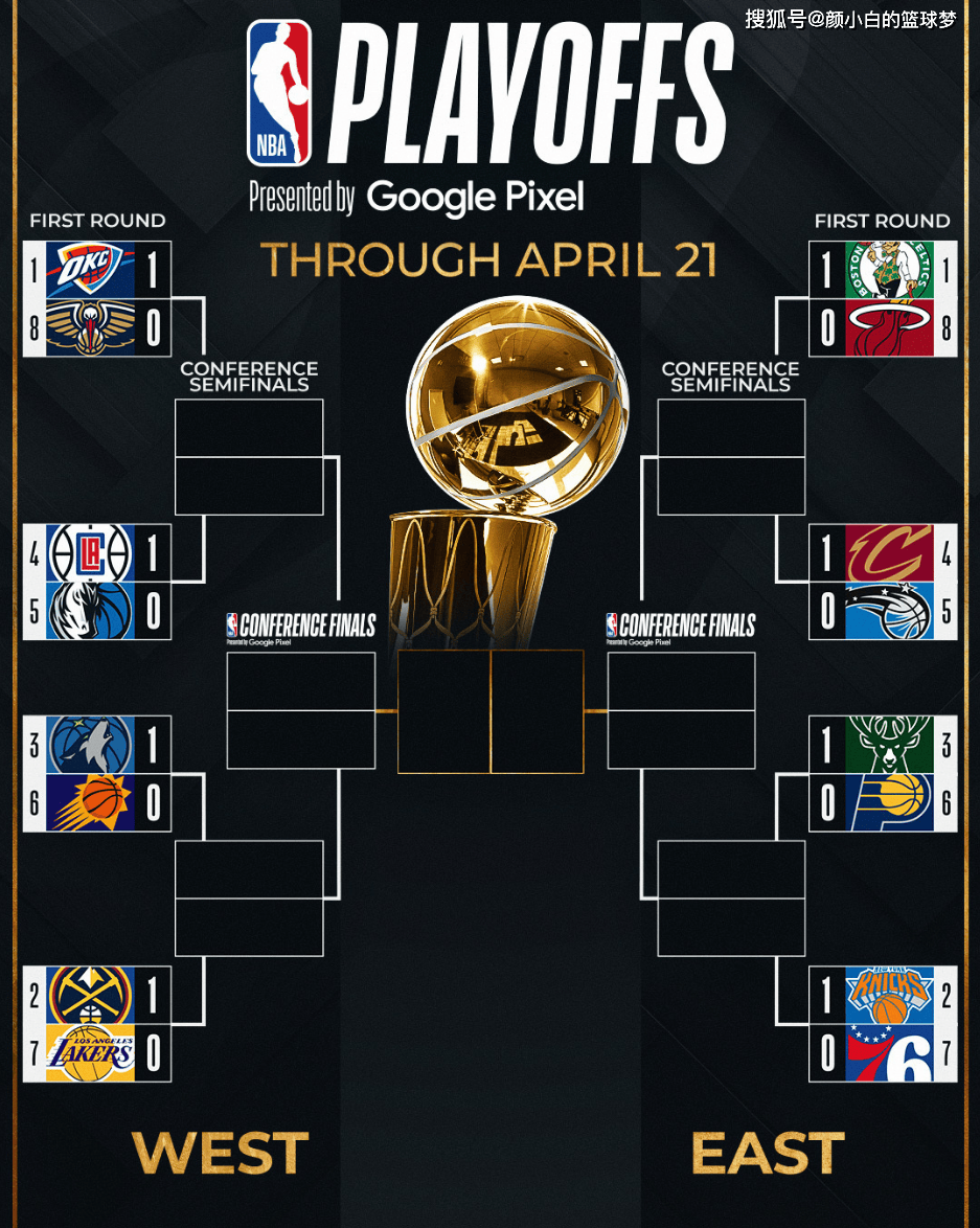 西部:雷霆1-0鹈鹕、掘金1-0湖人、森林狼1-0太阳、快船1-0独行侠;