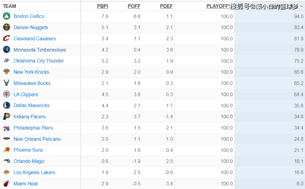 首轮晋级的概率再度更新,东部:凯尔特人94%、骑士81.9%、尼克斯65.6%、雄鹿65.2%、步行者34.8%、费城34.4%、魔术18.1%、热火6%;