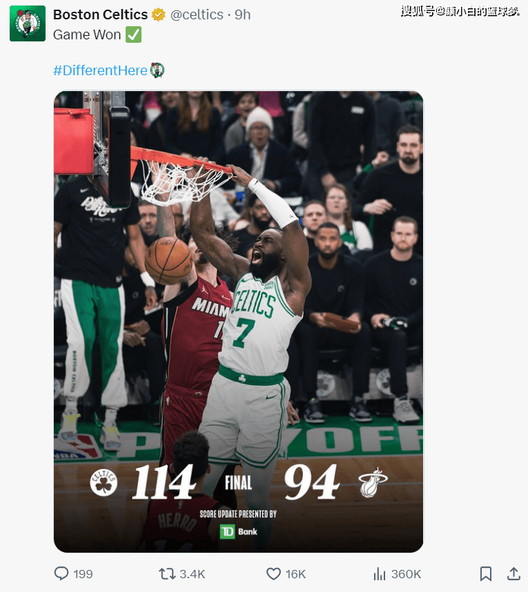 东部第一的凯尔特人114-94大胜热火,塔图姆18中7拿下23分10篮板10助攻拿下生涯首个季后赛三双。
