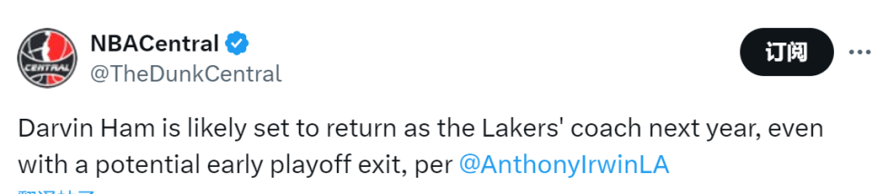 北京时间4月23日,据湖人记者Anthony Irwin报道,哈姆预计在下赛季继续执教湖人,就算季后赛早早出局,也不会影响他的帅位。