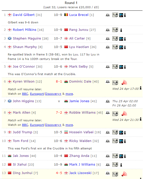 来到比赛中,反而是斯佳辉为球迷带来了惊喜,他在第一阶段4-5落后的情况下,10-9绝杀威廉姆斯。庞俊旭在9-8赢得赛点的情况下,连丢两局9-10被米尔金斯逆转。而丁俊晖在与利索夫斯基的第一阶段比赛中,以4-5暂时落后。今天晚些时候,丁俊晖将与利索夫斯基展开第二阶段的争夺,期待他的好消息!
