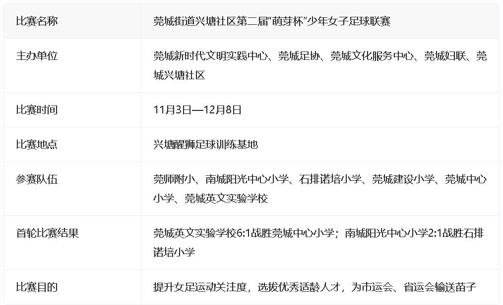 莞城街道兴塘社区第二届“萌芽杯”少年女子足球联赛的成功开幕,不仅为参赛的小球员们提供了一个展示自我和切磋球技的舞台,更是对女足运动在基层推广和普及的有力推动。通过这样的赛事,我们有理由相信,未来会有更多优秀的女足球员从这些“铿锵小玫瑰”中脱颖而出,为中国女足的发展贡献力量。