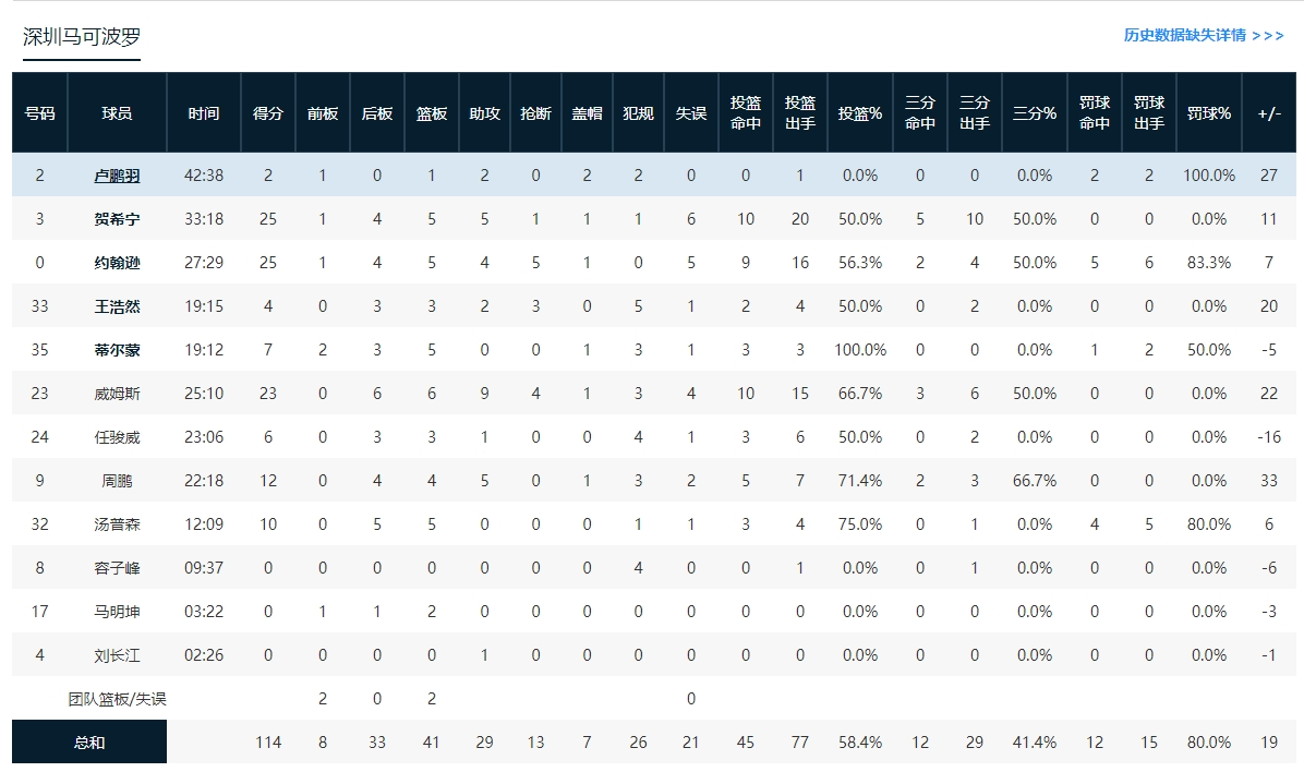 技术统计印证深圳战术成功:全队投篮命中率58.4%创赛季新高,快攻得分26-8碾压对手,内线得分62分较北控多出22分。约翰逊、贺希宁双核各取25分,威姆斯23分6助攻展现核心价值,周鹏、汤普森合砍22分形成有效火力补充。北控虽五人得分上双但替补仅得9分,廖三宁27分孤掌难鸣。