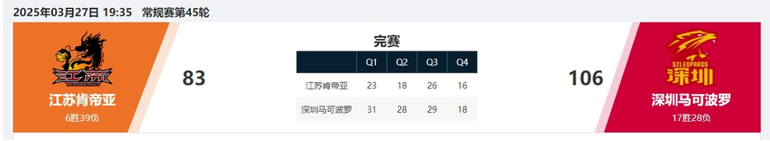 2025年3月27日,CBA常规赛第44轮焦点战,深圳马可波罗队在苏州奥体中心以106:83血洗江苏肯帝亚,完成本赛季对江苏男篮的四连横扫。这场23分的客场大捷不仅延续了深圳队对江苏的历史压制(总战绩30胜16负),更成为球队年轻化战略的里程碑战役。
