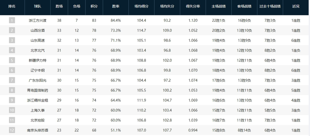 随着上海久事主场负新疆、北控险胜福建两场补赛落幕,20支CBA球队全部完成常规赛45轮较量。浙江方兴渡(38胜7负83分)与山西汾酒(33胜12负78分)已锁定前二,但第三至第十一位的排位仍存在超过200种组合可能。上海与北控同积72分并列第九,理论上仍存冲击前八可能;山东高速(32胜13负77分)与北京北汽、新疆伊力特、辽宁本钢(均为31胜14负76分)形成前四争夺集团。