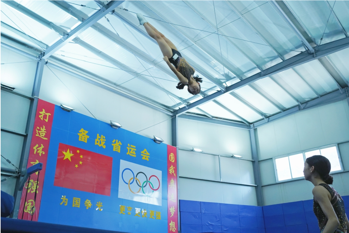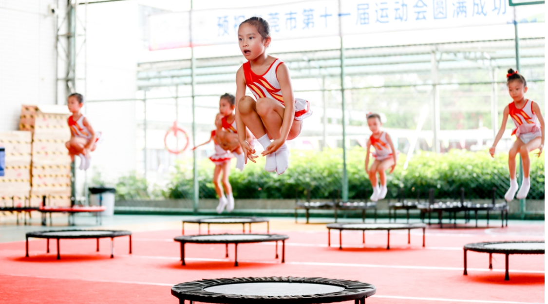 夕阳透过落地窗洒向训练馆,刚结束比赛的小选手们又围着蹦床嬉戏。黄子晴把金牌塞进书包夹层,转身爬上三米高的训练网——这个每晚加练两小时的茶山女孩,正把"空中锦缎"织向更辽阔的天空。