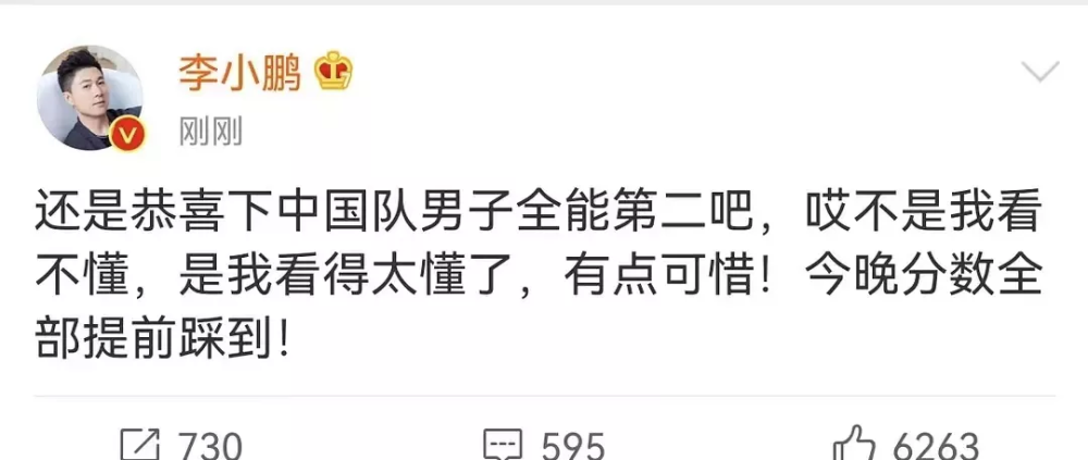 这件事情发生之后,在昨日晚间9:30左右,杨威和李小鹏分别发文表示惋惜。