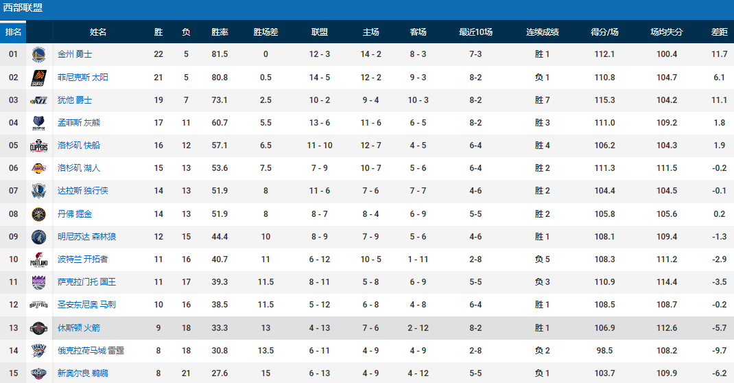 也确实,如今的火箭势头强劲,最近18场比赛,他们赢下了其中的8场,仅仅以9分之差不敌东部豪强雄鹿、输给西部最大黑马灰熊7分,差距都是很小的。眼下火箭的战绩来到9胜18负,33.3%的胜率位居西部第13名,距离西部第十、附加赛的区域也只有2个胜差。目前西部第十名是开拓者,近期他们吃到了5连败,只比火箭多赢了2场比赛而已。