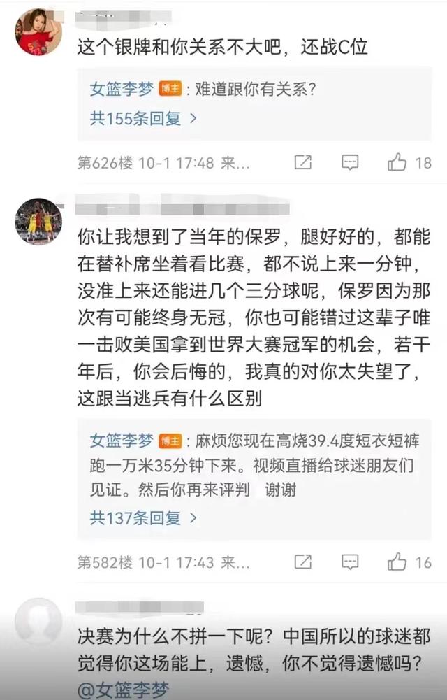 另一位网友写道:“你让我想到了当年的保罗,腿好好的,都能在替补席坐着看比赛,都不说上来一分钟,没准上来还能进几个三分球呢,保罗因为那次有可能终身无冠,你也可能错过这辈子唯一击败美国拿到世界大赛冠军的机会,若干年后,你会后悔的,我真的对你太失望了,这跟当逃兵有什么区别。”李梦回复:“麻烦您现在高烧39.4度短衣短裤跑一万米35分钟下来。视频直播给球迷朋友们见证。然后你再来评判谢谢。”
