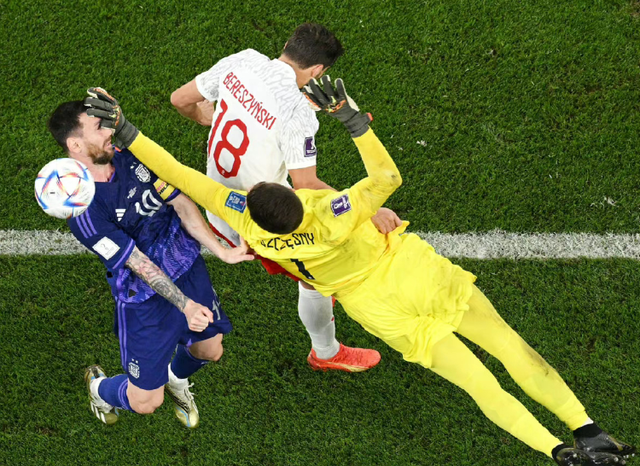 第35分钟,阿尔瓦雷斯抽射被扑,还有球权,传中到后点,梅西跟上头球打门,顶高了!但是什琴斯尼扑球过程中,打到梅西。经过VAR,裁判判罚点球,梅西主罚点球,被什琴斯尼单拳击出。波兰躲过一劫。
